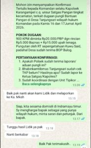 Menindaklanjuti informasi tersebut, http://Infotipikor.com melayangkan konfirmasi tertulis kepada Kapolsek Karangampel AKP Maryudi, selaku unsur Satgas Pangan. Menjawab konfirmasi, AKP Maryudi menyatakan keseriusannya. “Baik pak nanti akan kami lidik dan melaporkan ke Ka. Tunggu hasil lidik ya pak, nanti berkabar,” tulisnya melalui pesan WhatsApp, Senin (21/4/2026).